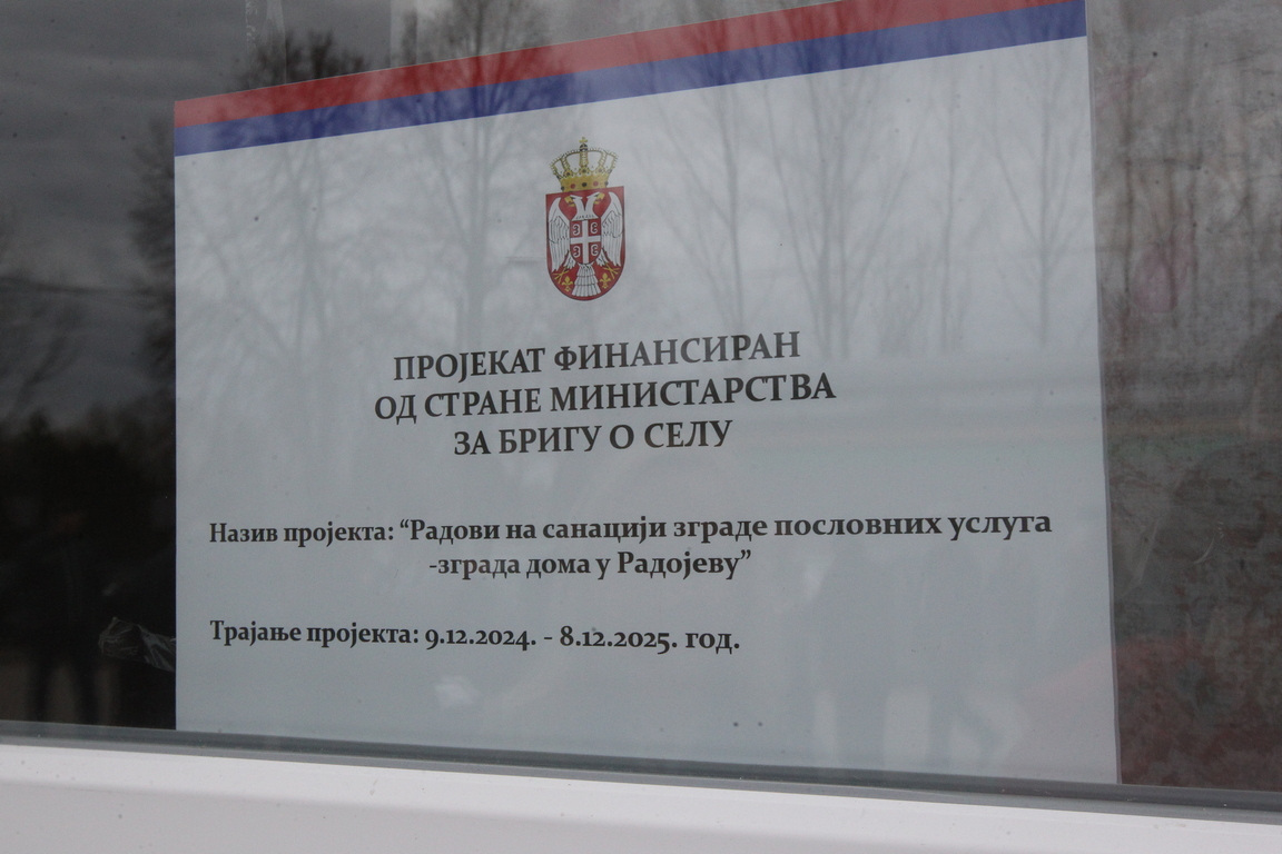 У селу Радојево, министар је заједно са председником општине Драганом Даничићем, обишао Сеоски дом који је обновљен средствима Министарства за бригу о селу. Кроз Програм доделе бесповратних средстава за опремања и уређења Сеоских домова, Нова Црња је добила готово 10 милиона динара који су уложени у тесарске и унутрашње радове, као и опремање објекта који је потпуно променио изглед и поново постао место где се окупљају и друже житељи овог, али и околних села. У овом мултифункционалном објекту, смештена је библиотека, месна заједница, омладински клуб, а у њему се већ састају удружења жена, као и Културно-уметничко друштво „Добривоје Путник“.