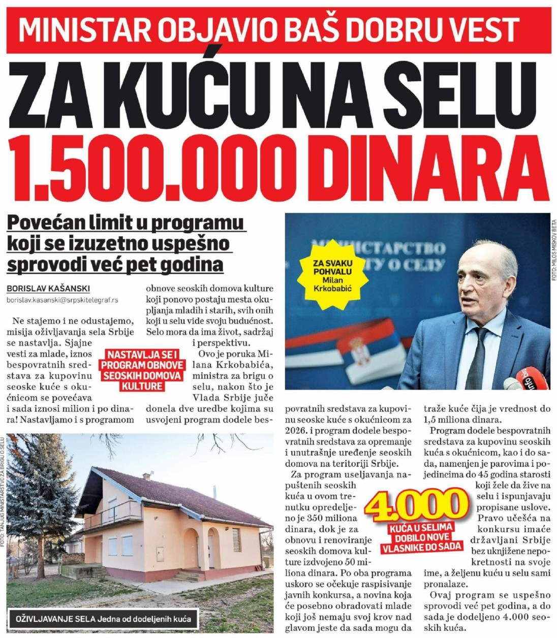 • Кркобабић: Ове године издвојено више средстава за куповину сеоских кућа, већ од 3. фебруара настављамо!